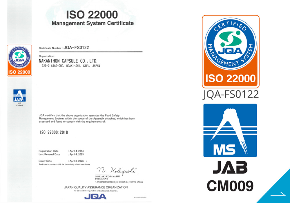 Nhà máy được hiệp hội dinh dưỡng thực phẩm và sức khỏe Nhật Bản (JHNFA) công nhận về “thực hành sản xuất và quản lý chất lượng phù hợp” trong tất cả các quy trình từ tiếp nhận nguyên liệu thô đến xuất hàng thành phẩm cuối cùng.